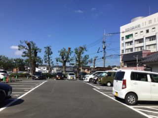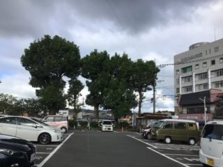 日田市三本松町の市営駐車場に大きなクスノキが5本あります